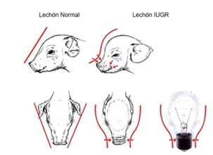Insuficiencia placentaria (IUGR): el bajo peso al nacimiento y otros indicadores como la morfología corporal, el índice de masa corporal y los ratios o relaciones del peso del cerebro/órganos vitales en los lechones, son indicadores de la ocurrencia de insuficiencia placentaria. Diversos tipos de alteraciones morfofisiológicas han sido reportadas en lechones que han padecido de IUGR; entre ellas el menor peso del tracto gastrointestinal y un retraso posdestete en la maduración de los órganos digestivos, en comparación con lechones de peso normal al nacimiento. Se ha reportado, además, menor tamaño de vellosidades intestinales, alteración de la permeabilidad de la mucosa del intestino delgado, del metabolismo de carbohidratos y lípidos a nivel intestinal, y la microbiota, que le afectará su crecimiento a lo largo de toda su vida.